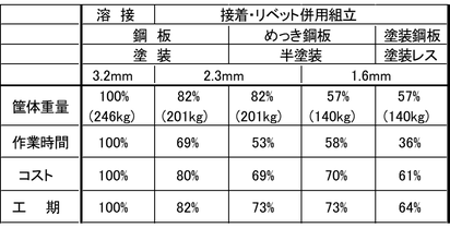 表13-1 接着・リベット併用組立による効果(溶接との比較)(800W×800D×2300Hの両面扉筐体)
