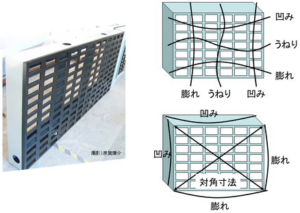 各種の競技場やイベント会場で見られる大型映像装置、空港や鉄道駅などの発着情報表示板、ビル壁面の大型広告表示装置など、大型の映像・表示装置はなじみのものとなっています。これらの大画面は一体でできるものではなく、図13-40に示すようなモジュール筐体を縦横に多数並べて大画面が構成されています。モジュール筐体は、表示モジュールが縦横に取り付けられるため、図に示すように、スカスカの構造になっています。そのため、膨れ、凹み、うねりなどの変形が生じやすく、モジュール筐体に変形が生じると、隣接するモジュール筐体との間に隙間が生じたり、表示面に凹凸が生じたりして、画像の精細さに影響します。