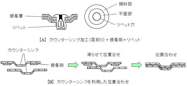 片手で持てる程度の部品であれば、リベット穴で位置決めすることは容易ですが、大きな重量物となると容易ではありません。そこで、図13-36【A】に示すように、板金に円錐台形状のカウンターシンク(皿絞り)加工がなされています。【B】のように、接着剤を塗布した部品を適当な位置で合わせてずらして噛み合わせると、接着剤の欠き取りや接着部周辺への付着もなく、容易にリベット穴を合わせることができます。