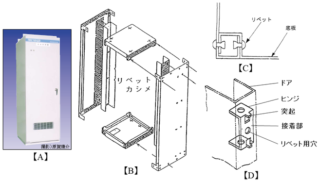 図13-35(A)は、接着・リベット併用法で製造された高さ2300mm、幅、奥行き800mm(両面扉)の工業プラント用制御盤の例です。接合部を面とするために、【B】に見られるように、板金の折り曲げ加工で糊しろが設けられています。底板と側板の接合部など高い強度と剛性が必要な部分では、底板、天板、側板のコーナー部に作り込まれたコーナー金具と、【C】に示すように、接着で角パイプ構造が形成されています。また、扉のヒンジ部には大きな力が加わりますが、【D】のような構造とすることで問題の無い強度が確保されています。