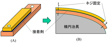 接着にとって重要な特性として<クリープ耐久性>があります。<粘着材>のカタログでは、<保持力>や<保持時間>と表記されていることが多いです。<クリープ試験>は、一般に、<前回>の図14-7(A) の引張りせん断試験片、(B1) の突合せ引張り試験片、(D1) (D2) (D3)などのはく離試験片などに荷重を負荷して、ずれ量や破断時間を測定しますが、<第20回>の「11.接着の内部応力 11.7 被着材の変形によって生じる応力 (4)部品のスプリングバックによるクリープ力」の図11-19で述べたような、被着材のスプリングバック力によるはく離の評価も重要です。被着材のスプリングバック力によるはく離の評価法の規格があるのかどうかは私はよく知りませんが、実際に用いる被着材を用いて、<第20回>の図11-19に示したように、かなり反らせた状態で平らな部材に押さえつけて接着して放置したり、図14-8に示すように、平らな部材同士を全面接着したものを楕円形の曲面に押しつけて高温環境などに放置するなどで評価を行うことができます。放置時間につれて、接着端部からはく離が生じてきます。楕円治具を用いるのは、位置によって曲率が異なるため、接着部に加わる力の大きさも位置によって変えることができるためです。