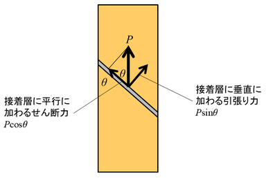 そこで、図14-11に示すような角棒の<スカーフジョイント>の試験片を用いて、軸方向に引張って評価します。軸方向に荷重Pで引張ると、接着層のせん断方向にはP・cosθ、接着層に垂直方向にはP・sinθの力が加わります。スカーフの角度θを変えることで引張り力とせん断力の比率を変えることができます。例えば、スカーフ角度が45度の場合は、せん断力と引張り力は同じで、P/(√2)となります。スカーフ角度が60度の場合は、せん断力はP/2、引張り力はP・(√3)/2となります。なお、破断時の引張り荷重値は求まりますが、せん断力で先に壊れたのか、引張り力で先に壊れたのかはわかりません。
