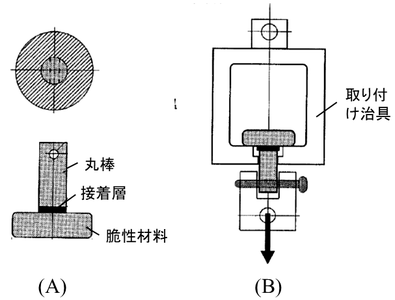 図14-10は、脆性材料の引張り接着強度試験の一例です。(A)のように、脆性材料の表面に丸棒を接着して試験片を作製し、(B)に示すように、取り付け治具の穴に丸棒を差し込みます。丸棒にピンを差し込んで引張ります。この時、丸棒のピン取り付け部はユニバーサルジョイントにしなければなりません。締め付けチャックなどで取り付けると、引張りの軸がずれやすいのでばらつきが大きくなります。なお、脆性材料と取り付け治具が接触する部分には、ゴムシートなどをはさむことで、脆性材料が割れる確率を大きく低減することができます。