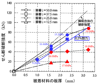 図14-12は、幅100mm、長さ200mmの熱間圧延鋼板(SPHC)同士を二液室温硬化型変性アクリル系接着剤(SGA)で接着した引張りせん断試験片の試験結果です。被着材料の板厚は、1.0mm同士、1.6mm同士、2.3mm同士、3.2mm同士と変えて、重ね合わせ長さは、12.5mm、25.0mm、37.5mm、50.0mmと変化させています。図中には、被着材料自体の0.2%耐力も青線で示してあります。いずれの重ね合せ長さにおいても、被着材料の板厚が厚くなると、接着部のせん断破断強度が高くなり、安定しています。赤色のデーターは、いずれも板自体の耐力以下で破壊していて、16~19MPaの正しいせん断接着強度が得られています。一方、青線の0.2%耐力以上の荷重で破断した接着部のせん断強度(青色の点)は、9~15MPa程度で低くなっており、正しいせん断接着強度が測定できていないことがわかります。