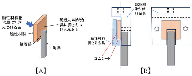 図14-9は、脆性材料のせん断接着強度試験の一例です。(A)のように、脆性材料に角棒を接着します。次に、(B)に示すように、脆性材料を治具に押しつけます。この時、押さえ金具と脆性材料が接触する部分には、ゴムシートなどをはさむことで、脆性材料が割れる確率は大きく低減できます。締め付け力は手締め程度で十分です。角棒を引張ることで、せん断強度を測定することができます。