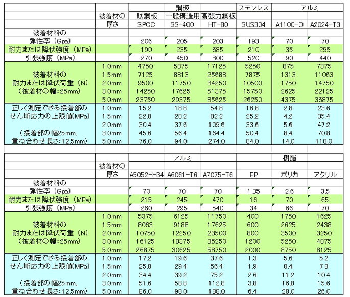 表14-2は、被着材の耐力または降伏強度と、正しく測定できる接着部の平均せん断応力(接着面積:12.5×25mmの場合)の上限値を種々の材料について示したものです。例えば、幅25mm、板厚1.5mmの軟鋼板の場合は、引張り荷重が約7125Nで降伏強度に達します。この時、幅25mm、ラップ長さ12.5mmの接着部には、22.8MPaのせん断応力が加わっています。接着部の強度が22.8MPa以下であれば、被着材料の降伏強度以下で破壊するので、正しく接着強度が測れていますが、接着部の強度が22.8MPa以上であれば、被着材料の降伏強度以上で被着材料自体が伸びるため、正しい接着強度は測れないことになります。被着材料の板厚を3mmにすれば、被着材料の降伏強度は約14,250Nとなり、接着部のせん断強度が45.6MPaまでであれば正しく測定できることになります。